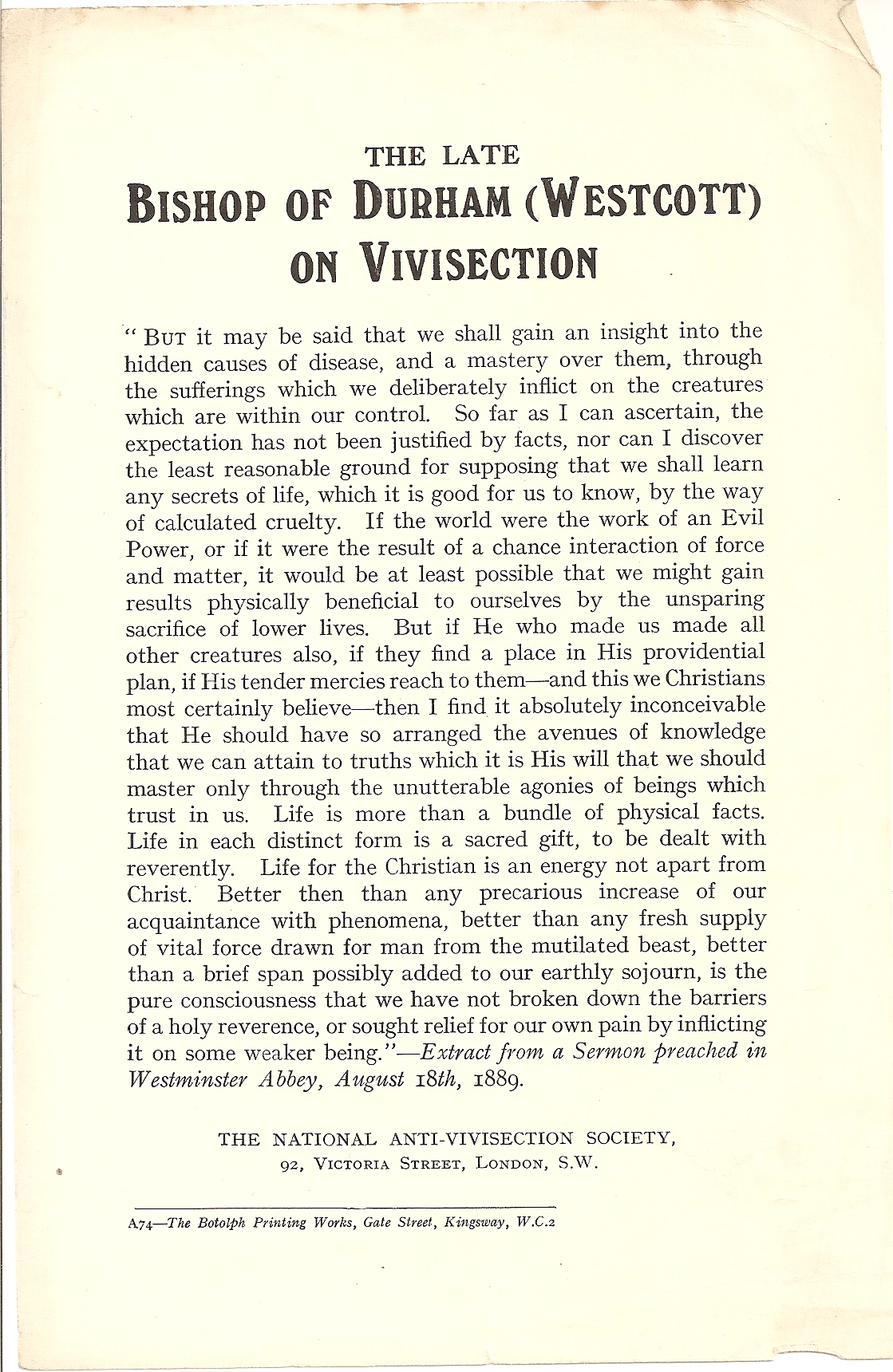 Below is a copy of a tract obtained from an English antiquarian book dealer. The tract is an extract of a sermon delivered at Westminster Abbey on 18 August, 1889 by Brooke Foss Westcott (1825-1901). It was distributed by the National Anti-Vivisection Society (Victoria Street, London).